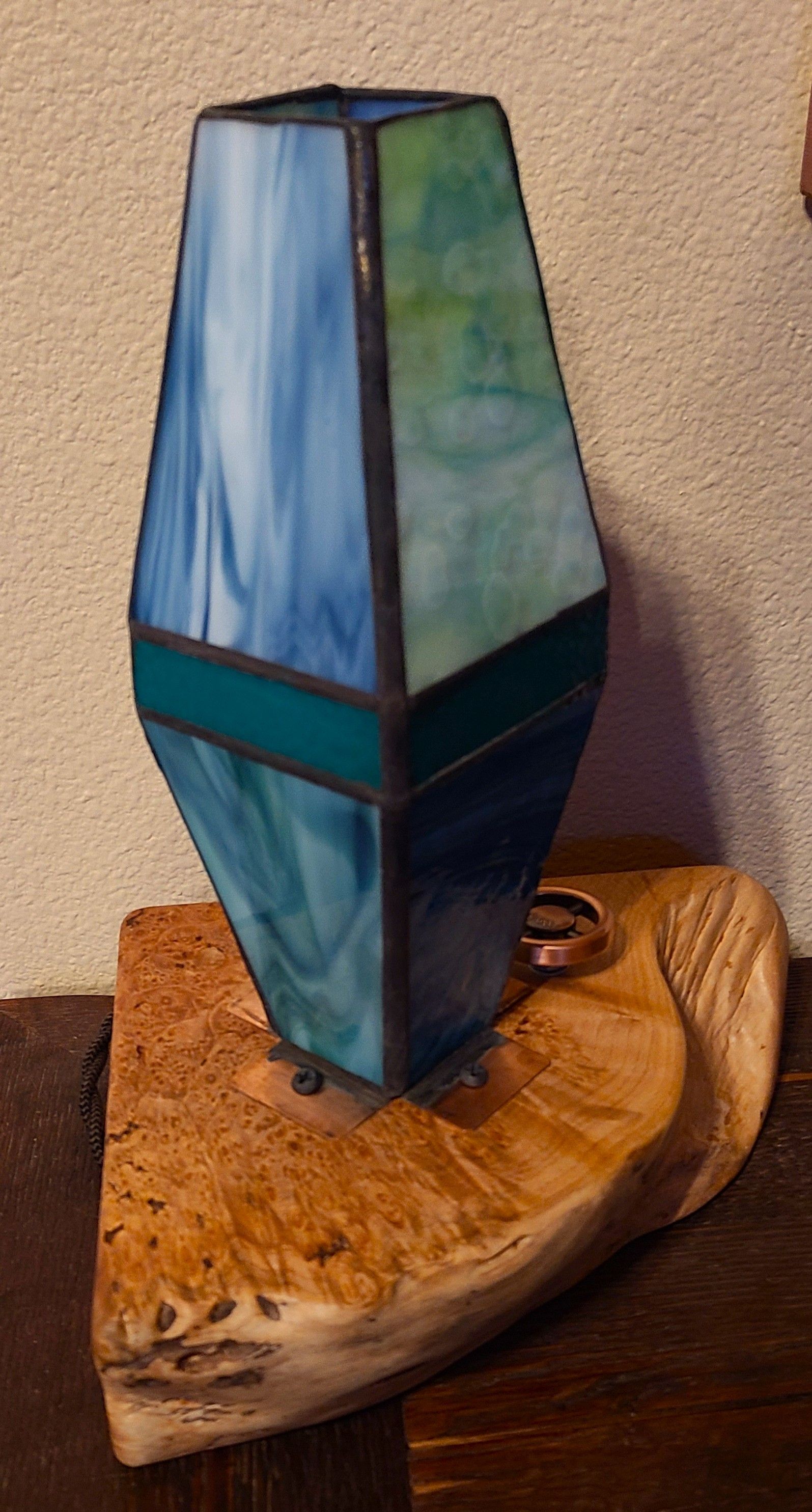 3" x 9" Square Stained Glass on Maple Burl with LED Light and Copper Knob Dimmer Control. 11" total height. 60" twisted grey cloth cord with vintage style polarized plug.