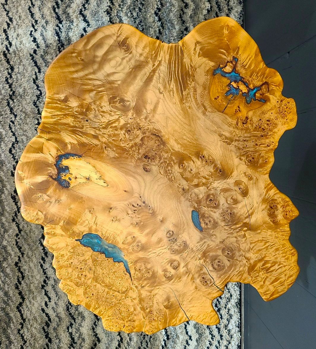 Maple Burl Slab End Table with 3 Branch Post in River Rock Base. Live edges and blue opal epoxy accent fill. Tongue-oil finish. 22" x 21" x 24" high. 2" slab thickness.